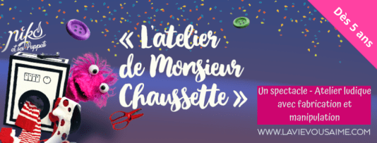 La machine à fabriquer les marionnettes est cassée mais Mr Chaussette va apparaître par magie pour nous expliquer comment il est possible de créer sa propre marionnette. Mr Chaussette et Niko accompagnent les enfants dans la réalisation d’une marionnette en feutrine que les enfants vont ensuite apprendre à manipuler. Puis ils lui trouveront un nom, une voix… C’est drôle, facile et ludique : Une vraie découverte pour les enfants ! Les enfants gardent la marionnette – Il est préférable de réaliser l’atelier spectacle dans un lieu avec tables et chaises (salle de classe, réfectoire…).